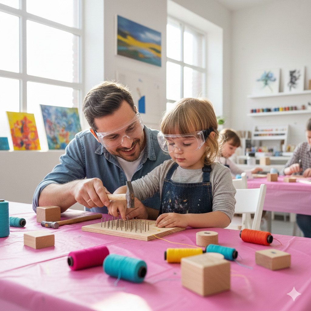 Our Daddy + Me Nail and Thread Art Class is a heartwarming, creativity-filled art experience designed to help dads and their children connect, create, and make meaningful memories together. This hands-on kids art workshop centers around crafting a beautiful nail-and-thread heart design—an engaging project that blends creativity, teamwork, and fun. It’s more than just an art class; it’s an opportunity for families to step away from screens, schedules, and responsibilities to enjoy quality time in a warm and welcoming studio environment.